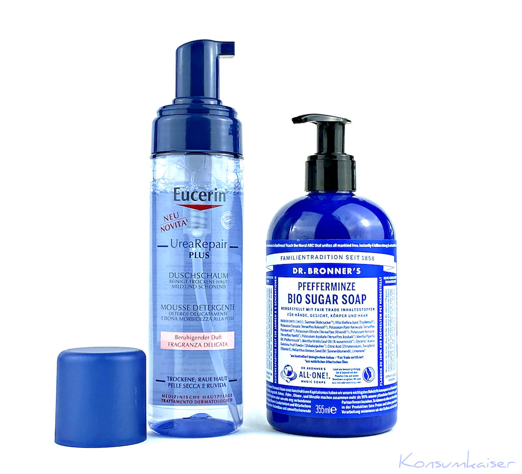Das dynamische Duo, dass ich heute hier vorstelle hat eigentlich nur die wundervoll blaue Farbe gemeinsam. Ansonsten könnten die Produkte nicht unterschiedlicher sein. Der Urea Repair Plus Duschschaum von Eucerin ist recht sanft und duftet ganz leicht nach Babypuder. Dagegen sorgt die Bio-Zucker-Seife von Dr. Bronner´s für wortwörtlich tiefgreifende Sauberkeit, mit der Power von Pfefferminze.