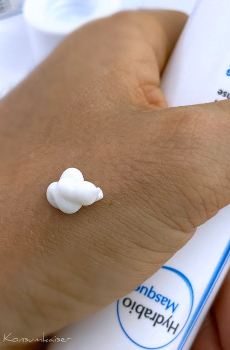 Die Konsistenz ist zwar cremig, aber trotzdem schön leicht, sodass man die Maske auch gerne im warmen Sommer nutzt. Sie lässt sich schnell und weich verteilen, danach zieht sie geradezu rasend schnell in die Haut ein. Nach zehn Minuten werden Überschüsse mit einem sauberen Handtuch abgenommen, oder aber im Gesicht verrieben. So mache ich das. Bitte nicht abwaschen! Ich bin da immer unschlüssig, ob das Abwaschen einer Feuchtigkeitsmaske nicht gar kontraproduktiv sein kann.