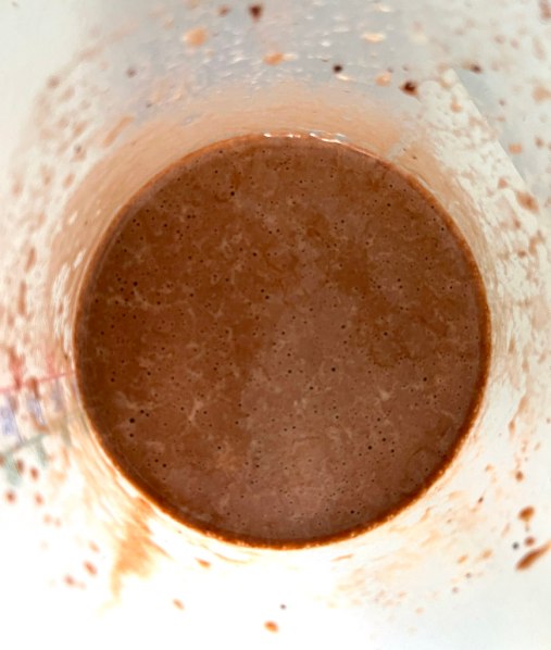 - In der Zwischenzeit die Pulvermischung (Protein, Kakao und Xucker) in die Milch schütten und im Mixer (ich nutze einfach einen Rührstab) schön schaumig Schlagen. Es soll viel Luft unterkommen, damit das Endergebnis luftig-blasig wird. Wer die Milch vorher abkocht, wird einen noch authentischen Puddinggeschmack bekommen, kostet aber Zeit, denn die Milch muss vorher wieder abkühlen.