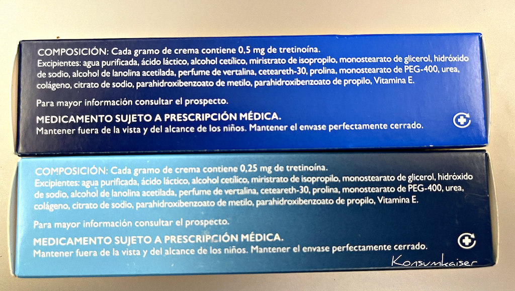Da ich in Deutschland bislang noch kein Tretinoin verschrieben bekommen habe, wollte ich nun auf ein bekanntes Produkt aus Spanien ausweichen, welches eigentlich ebenfalls verschreibungspflichtig ist. Allerdings handhaben das die spanischen Apotheken augenscheinlich ziemlich lax, sodass ich in einer ganz normalen Apotheke im kanarischen Urlaubsgebiet Maspalomas sofort fündig wurde.