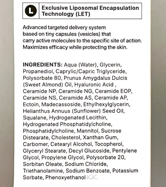 Aqua, Pentylene Glycol, Panthenol, Tricaprylin, Glyceryl Stearate, Candelilla/Jojoba/Rice Bran Polyglyceryl-3Esters, Ascorbyl Glucoside, Caprylyl Caprylate/Caprate, Ectoin, Niacinamide, Squalane, Ceramide NP, Ceramide AP, Ceramide AS, Ceramide NS, Ceramide EOP, Linoleic Acid, Linolenic Acid, Cholesterol, Asiaticoside, Madecassic Acid, Asiatic Acid, Tocopherol, Allantoin, Beta-Glucan, Glycerin, Sodium Hyaluronate, Hydrogenated Lecithin, Prunus Amygdalus Dulcis (Sweet Almond) Oil, Cetearyl Alcohol, Sodium Stearoyl Lactylate, Citric Acid, Dipropylene Glycol, Sucrose Distearate, Helianthus Annuus (Sunflower) Seed Oil, Propylheptyl Caprylate, Xanthan Gum