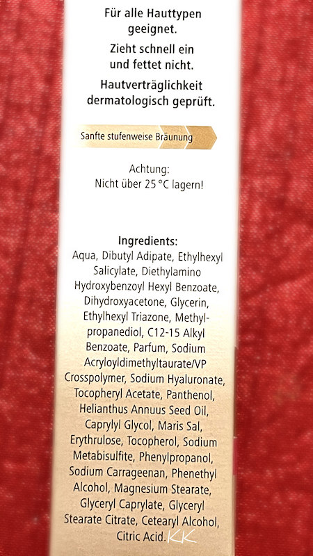 Die Färbung der Haut wird mit den alten Bekannten DHA und Erythrulose realisiert, die Kombination finde ich persönlich optimal, da meist eine sehr natürliche Tönung erreicht wird. Allerdings ist daran nicht aussergewöhnliches, und ich finde die Aussage der Firma „Express-Bräune“ ein klein wenig irreführend, denn nach ca. drei Stunden fangen alle Produkte dieser Gattung (und mit den beiden üblichen SB-Wirkstoffen) an eine Bräunung der allerobersten Hautschicht zu erzeugen. Was daran „Express“ sein soll? Keine Ahnung.