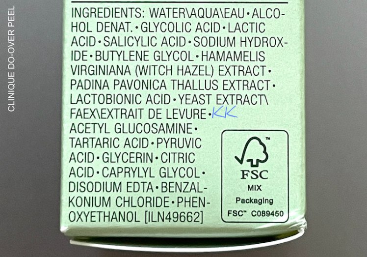 Die Säuren im Einzelnen: Glykolsäure, Milchsäure, Salicylsäure, Lactobionsäure, Weinsäure, Benztraubensäure und Zitronensäure. Die einzelnen Gewichtungen der Säuren sind nur schwer abzuschätzen (durch die Position in der INCI-Liste). Clinique nennt das „Micro-dosed“, allerdings ist die Gesamtheit der Säuren dann nicht unbedingt zu unterschätzen. Bei der Zitronensäure vermute ich aber kaum richtiges Peelingpotenzial, sondern die geringe Dosis wird wohl eher zum Einstellen des pH-Wertes geeignet sein.