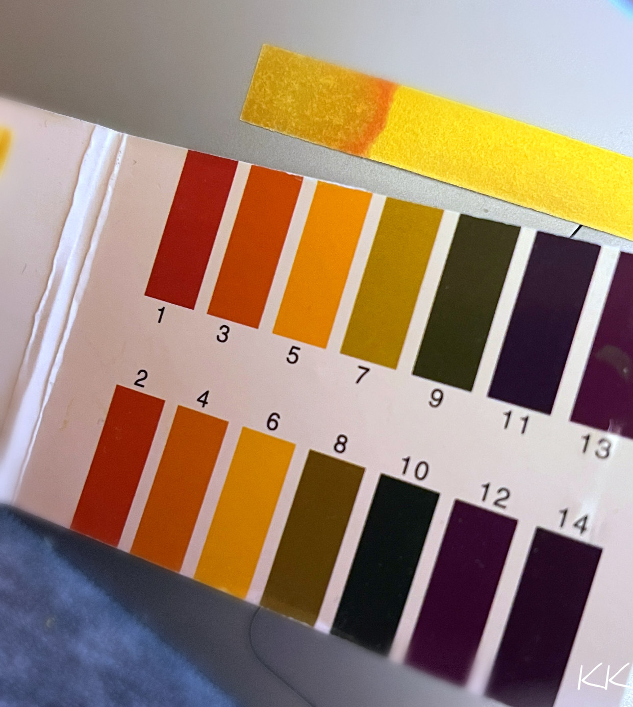 Meine laienhafte Messung hat einen pH-Wert um ca. 3 ergeben. Er kann sogar noch unter drei liegen, denn das Indikatorpapier färbte sich nach dem Foto sogar noch ein wenig stärker orange-rötlich. Das ist selten bei Parfümerieprodukten, aber eben auch potenziell reizend.