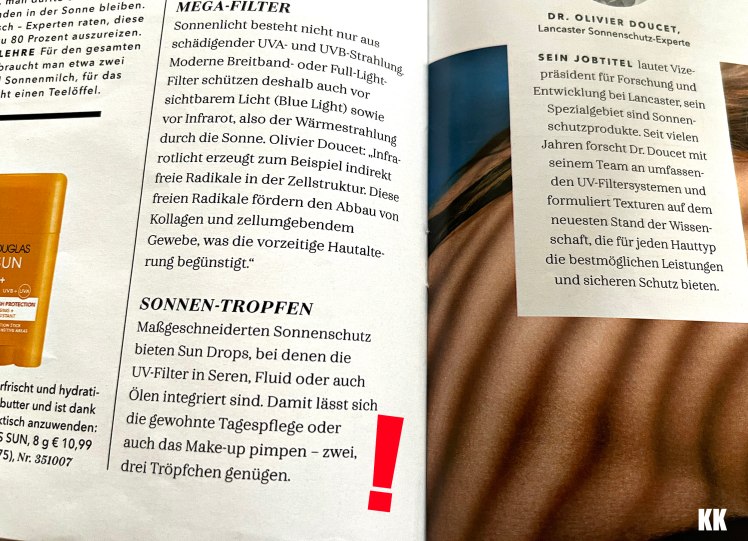 Schlimm und unverfroren wird es aber, wenn „ExpertInnen“ und das Douglas-Magazin aber die Kundschaft ins Verderben locken, indem sie ihnen die Sonnenschutz-Drops mit geringer Auftragsmenge schmackhaft machen: