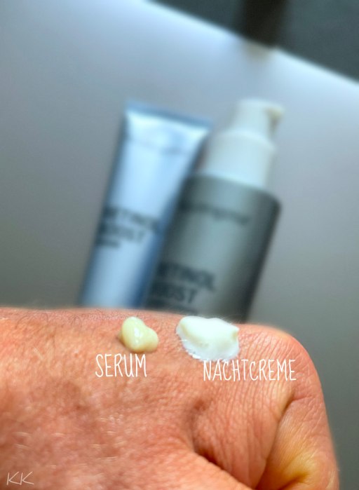 Die Nachtcreme ist dann überraschend wenig pflegend, eher einer leichten Emulsion ähnlich, die die Haut zwar nicht beschwert, aber trockene und ein wenig lipidärmere Haut doch wahrscheinlich im Stich lässt. Selbst bei warmen Temperaturen (wie gerade) ist sie mir doch zu wenig, und das ist eigentlich enttäuschend für eine Retinol-Nachtcreme, die sich wahrscheinlich doch hauptsächlich an anspruchsvollere Haut wendet.