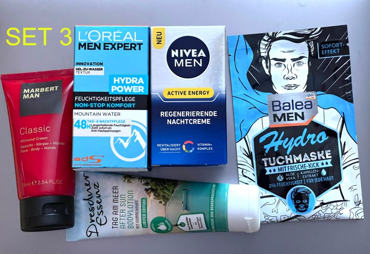 Ich würde mich über Set 3 sehr freuen und übernehme natürlich die Versandkosten. Ich würde es meinem Freund schenken, es ist so schwierig ihn an Hautpflege zu gewöhnen. Am liebsten geht er ohne Creme aus dem Haus, ist aber auch schon 40 ig 🙂