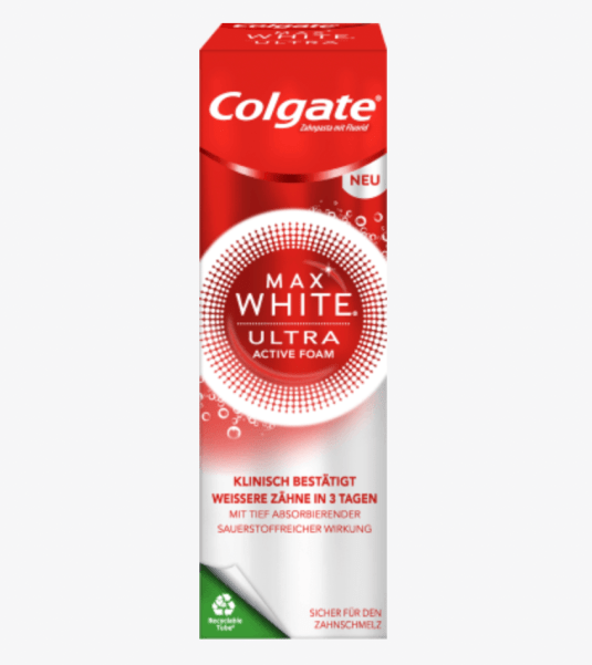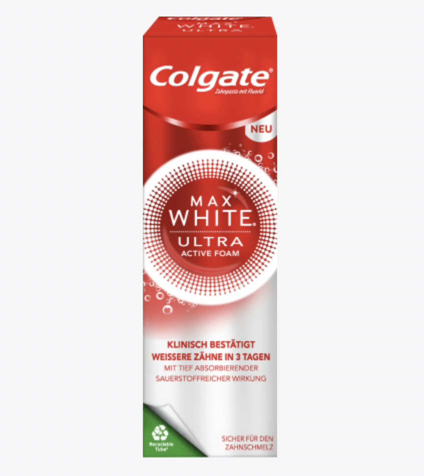 Colgate kommt nun mit einer weiteren Neuheit, die weißere Zähne auf Sauerstoffbasis verspricht. Also kein optischer Effekt, sondern nach drei Tagen der Anwendung sollen die Zähne tatsächlich von so einigen unschönen Rückständen (wie zB. Tee-, Kaffe-, Rotwein- und Nikotinverfärbungen) befreit sein.