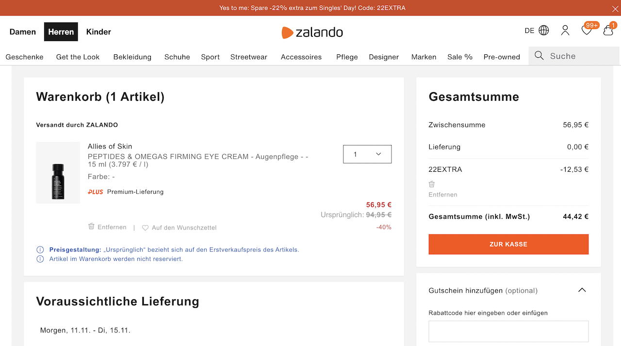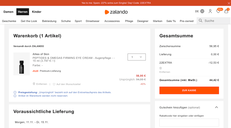 22% Rabatt auch auf reduzierte Kosmetikprodukte, geliefert wird von Sephora, dem Marketplace-Partner von Zalando.