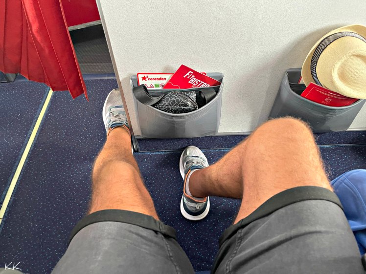 Bei der Sitzplatzauswahl hatte ich dann ein Experiment geplant. Ich wollte mal ganz vorne sitzen und schauen, ob der Beinabstand deutlich angenehmer sein wird, und ob es nervig ist den Flug über nur auf eine Wand zu starren.