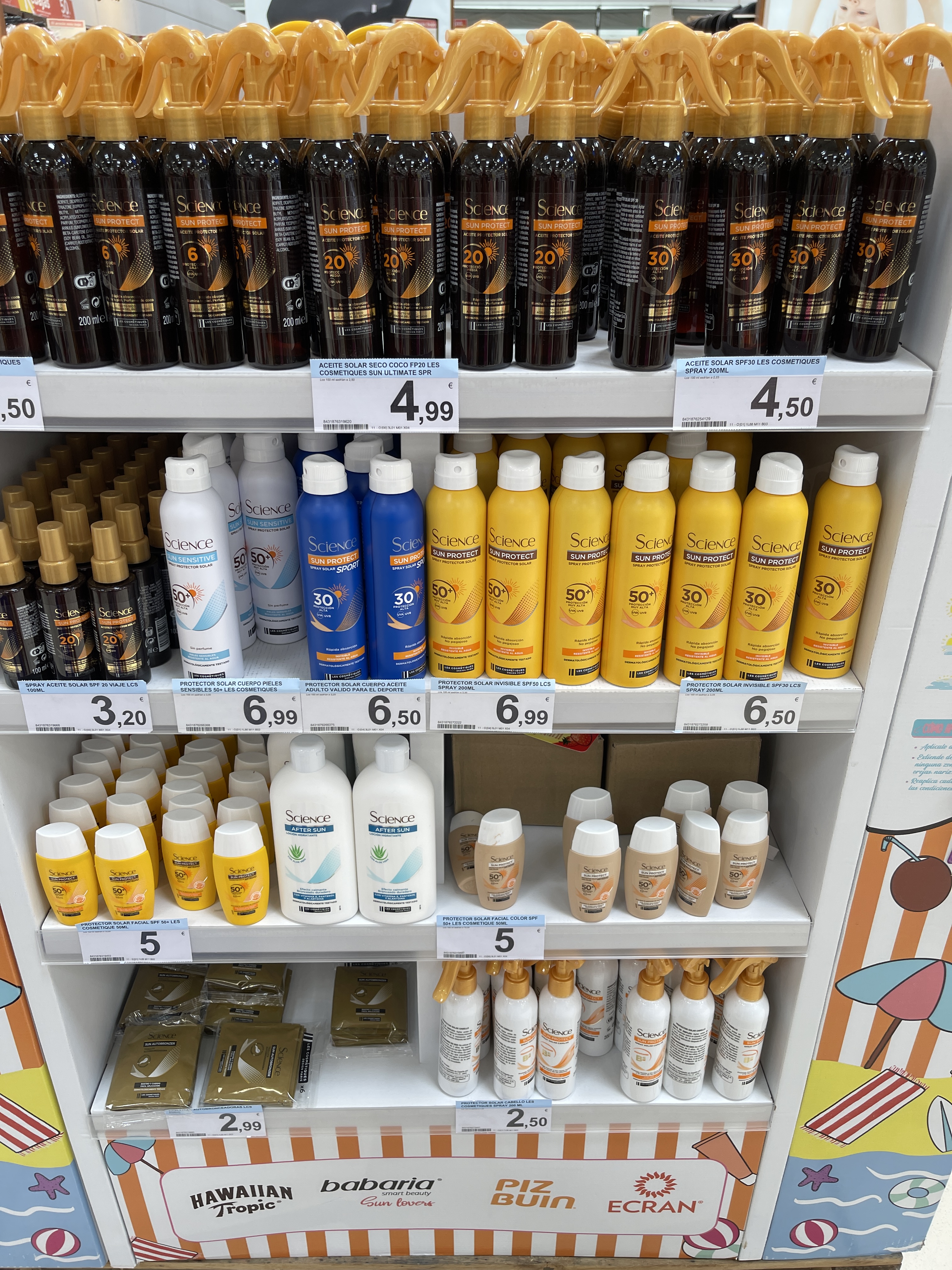 Überhaupt frage ich mich, warum so viele Touristen eigentlich noch ihre Koffer mit Sonnenmilch vollpacken? Wenn ich mich zB. hier umschaue, bekomme ich Sonnenpflege mittlerweile teils billiger als in Deutschland, dazu ist die Auswahl grösser und besser.