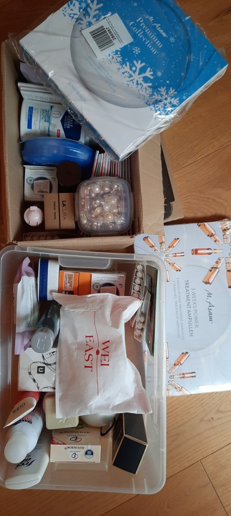 Darunter sind Fotos mit einem Karton & einer Plastikbox. 2 x ASAM Ampullen, alle Arden Capsules im Tupper, WEI EAST. Das alles 2 x aus verschiedenen Perspektiven geknipst. Dann endet die Fotostrecke hier. Also die letzten 4 Foto`s.