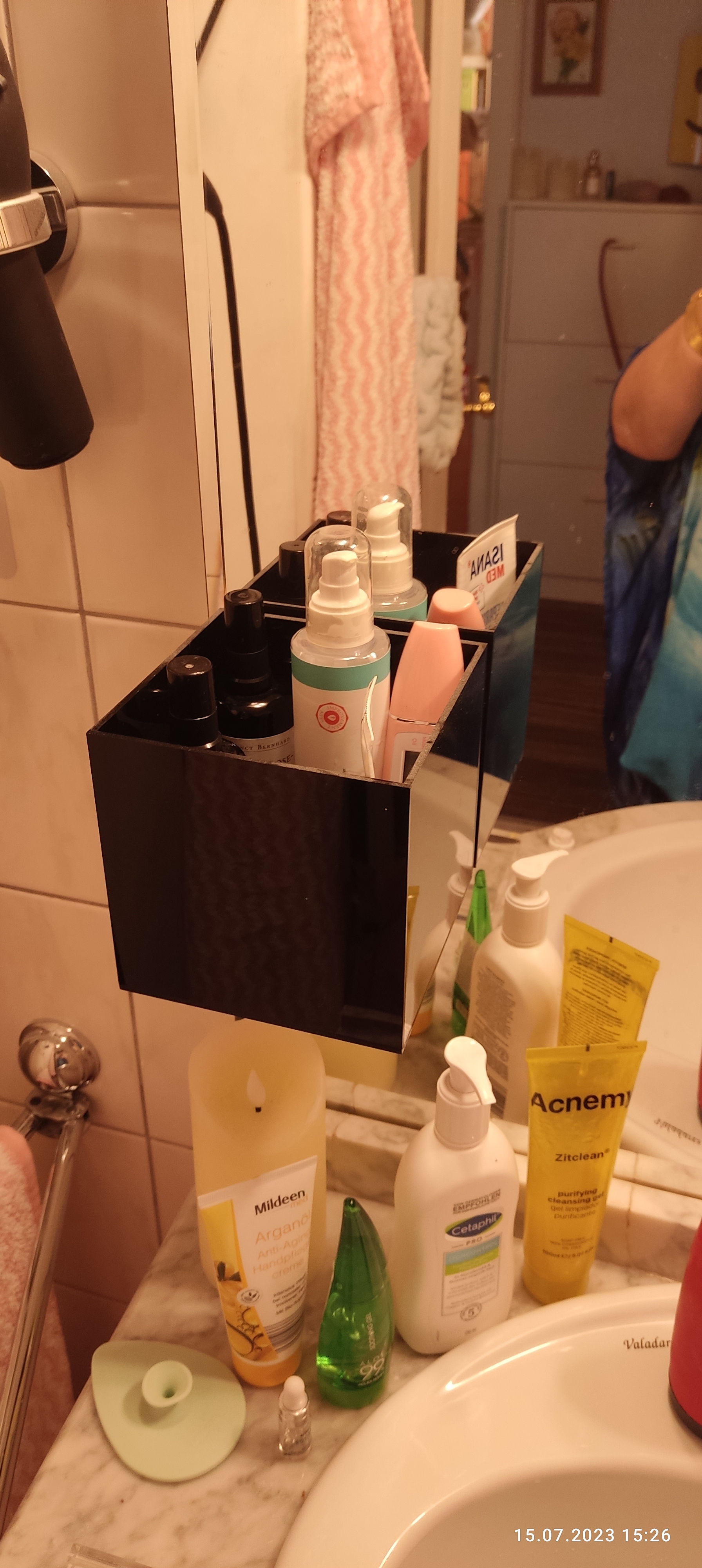 Darunter ist ein schmaler Schrank, mit Plastikkörbchen, Physiogel Proben, Aigner No.1, Veneta Bottega, Borotalco Duschgel & Deo. Auch richtig zugeordnet. o.k.
