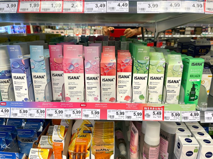 Nun steht da also auch bei Rossmann der Reigen der ambitionierten Hautpflege, mit den üblichen Verdächtigen, Niacinamid, Bakuchiol, Peptiden oder Ceramiden. Alles was man schon mal irgendwo auf Instagram in schreiend großen Lettern mit vier Ausrufezeichen gesehen hat, findet man nun für einen kleinen Preis (so ist das ja traditionell bei diesen Sachen) im Laden nebenan.