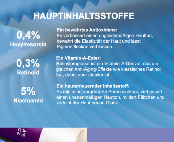 Wäre es wenigstens ein verkapseltes aus der neuen Generation, aber Retinylpropionat ist zahnloser als andere Retinoide, auch wenn es durchaus eine gewisse Wirkung haben soll. Allerdings wird das nur mit viel Geduld funktionieren, so ist das nun mal mit diesen weit entfernten Verwandtschaften. Das braucht dann gleich mal drei Pullen, bis sich da was tut – und dann auch nur minimal.