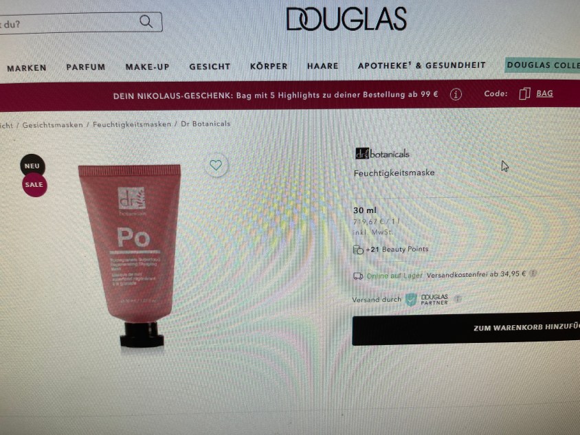 Schön auch, was Douglas daraus macht: Eine „Feuchtigkeitsmaske“, na denn…Wer sagt denn, dass sich die Trockenheitsfältchen nicht auch hinten freuen, wenn sie mal eine Portion Feuchtigkeit zusätzlich bekommen? 🙂