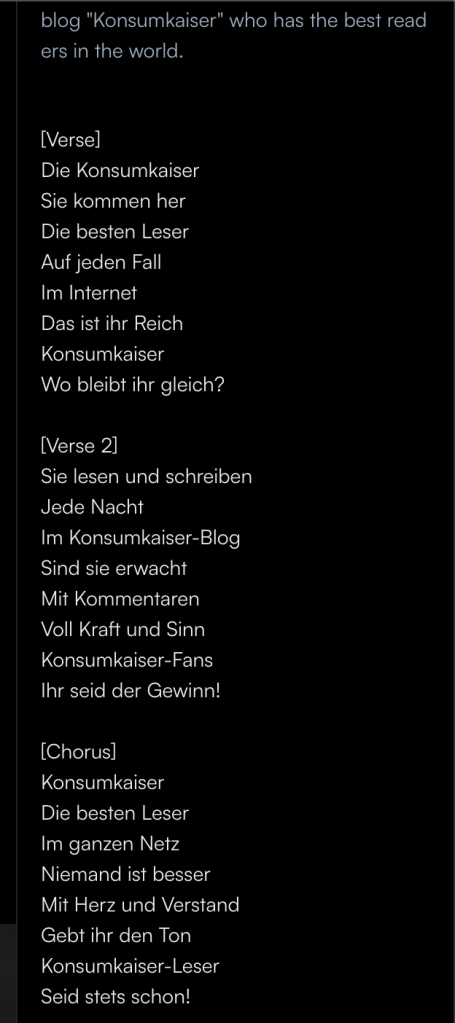 Letztens habe ich mir einmal Programme angeschaut, die per KI Musik erstellen. Also man füttert z.B. die KI mit Schlagworten wie „Eine hymnische Uptempo Nummer die gefühlvoll beschreibt, wie toll der Konsumkaiser Blog ist, wie aussergewöhnlich die Leserinnen und Leser sind, und wie schön doch das Leben ist.“ Hört mal rein…