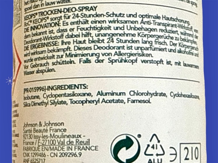 Das RoC Deo KEOPS mit Alu war ein Tipp einer Leserin, und ich bin überrascht. Es gibt das Deo hier immer im Doppelpack, 2 x 150 ml für knapp 12 Euro. Nicht billig, aber hochwirksam und trotz Farnesol in der Inhaltsstoffliste duftet es überhaupt nicht. Da man Sprays ohne Duft kaum noch findet, bin ich froh über dieses Produkt, obwohl Duftstoffallergiker da bitte trotzdem vorsichtig sind.